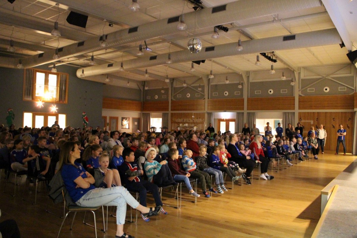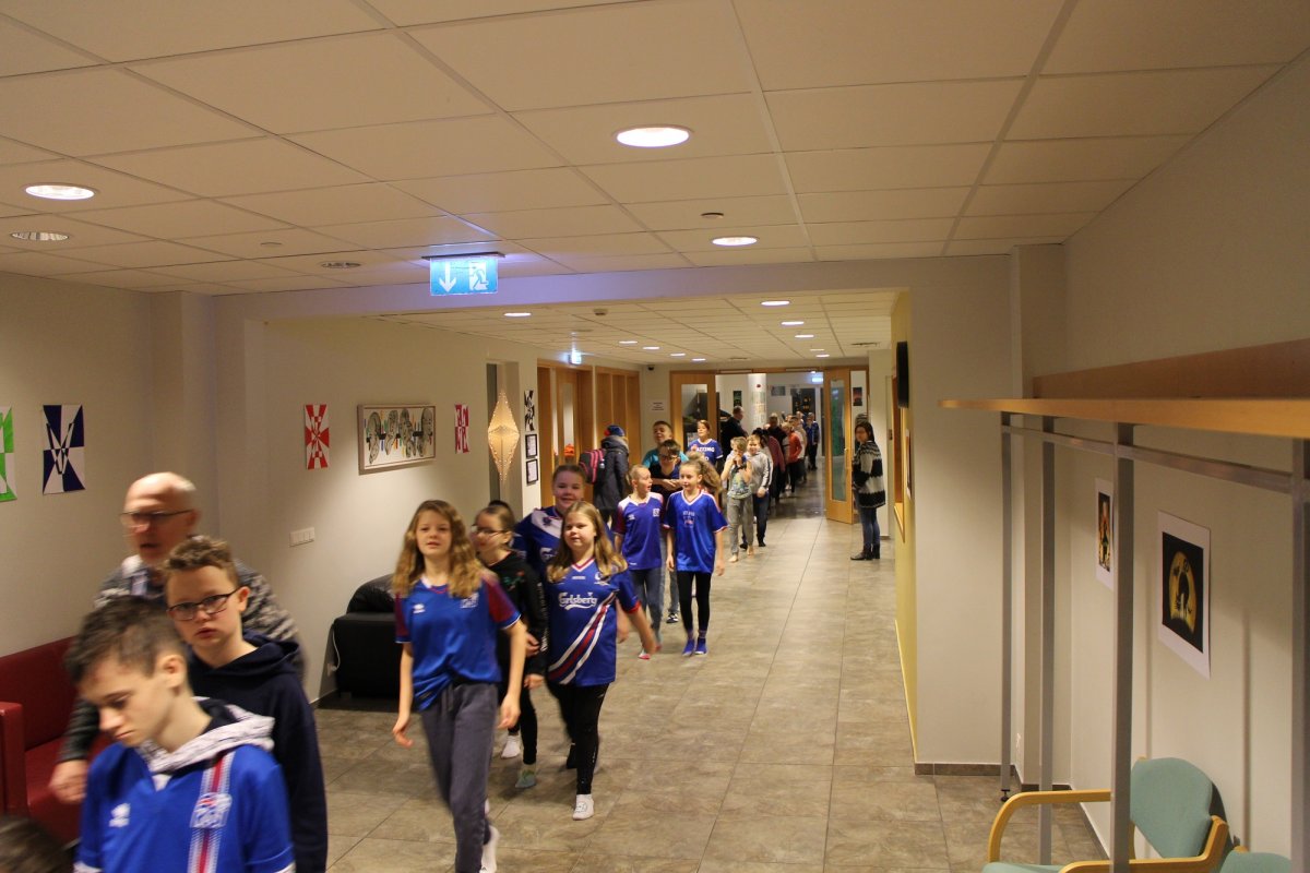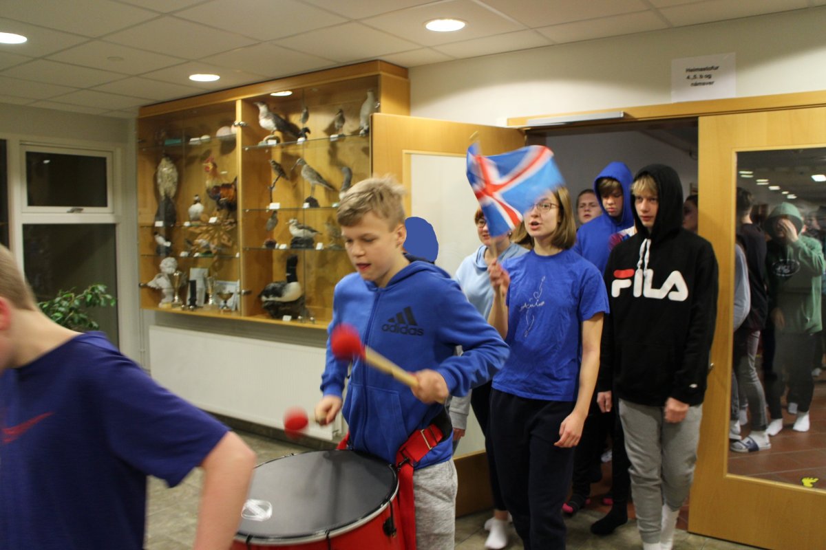 Í tilefni af því að fullveldi Íslands verður 100 ára 1. desember ákváðum við að skella í smá fögnuð. Við buðum nemendum að mæta í bláum fatnaði eða fánalitunum og fórum í skrúðgöngu. Gekk hersingin undir trommuslætti um allan skólann og enduðum í sal þar sem við horfðum á stuttmynd og sungum Ísland er land þitt og Ég sá mömmu kyssa jólasvein.
