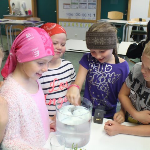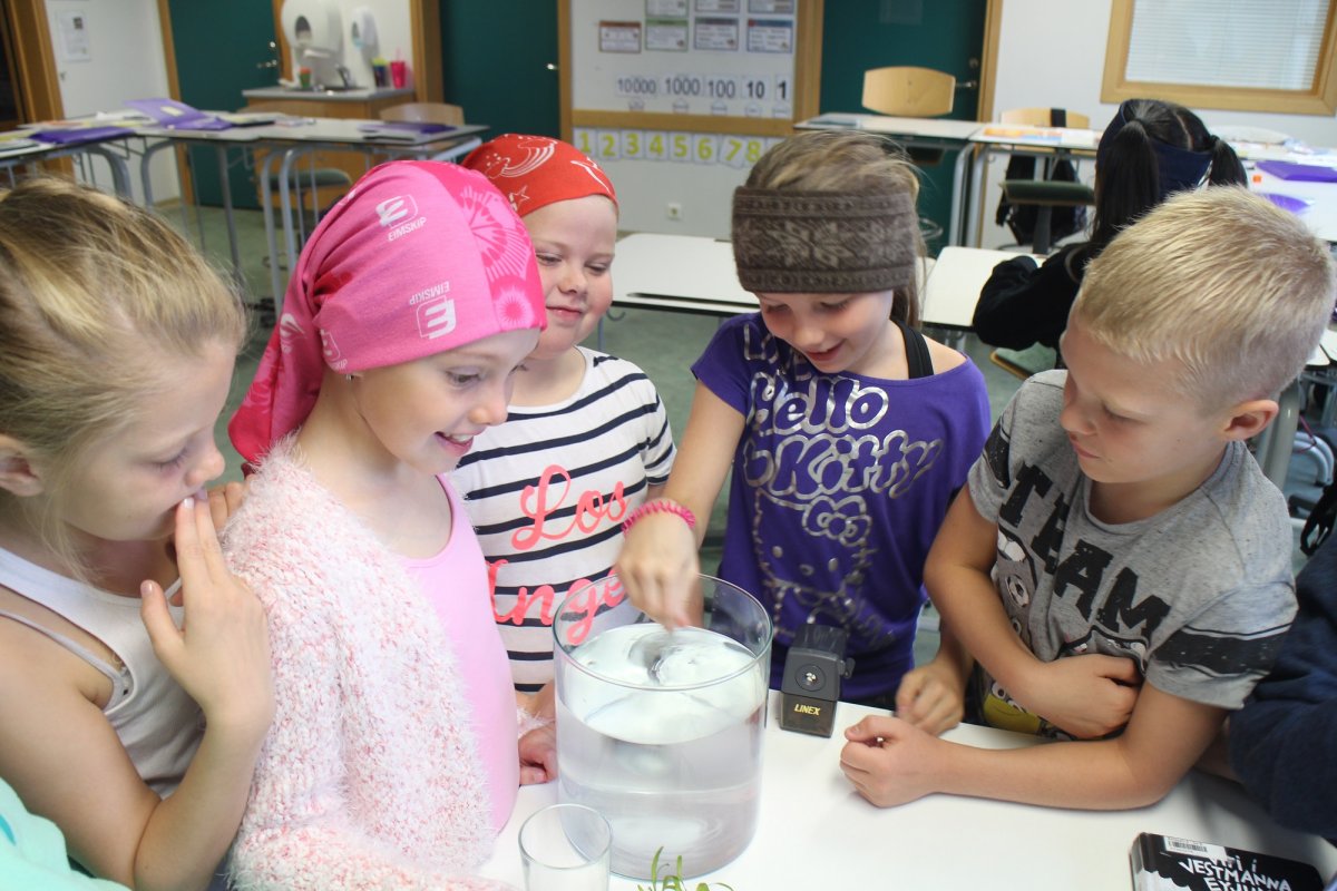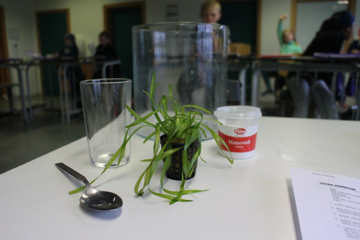 4-LF var í dag að gera tilraun með ljóstillífun þar sem markmiðið var að búa til súrefni. Sett var vatn í stóra glerkrukku og matarsóda út í vatnið. Vatnaplanta var sett ofan í glas á hvolf ofan í stóru glerkrukkuna. Eftir 4 tíma kíktu krakkarnir á niðurstöðurnar og þá mátti glögglega sjá súrefnisbólur sem plantan hafði myndað á glerið. Kíkið endilega á myndirnar.