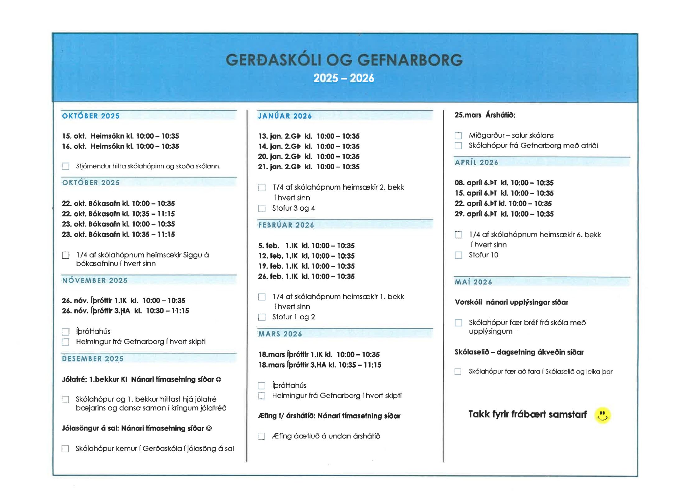 Það hefur verið gott samstarf á milli Gerðaskóla og Gefnarborgar í nokkur ár, hér má sjá áætlunina fyrir skólaárið 2025 - 2026 en hún birt með fyrirvara um breytingar.